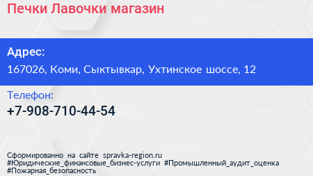 Печки-Лавочки, магазин по адресу 167026, Коми, Сыктывкар, Ухтинское шоссе, 12 в дальнейшем Организация, размещена в следующих категориях: