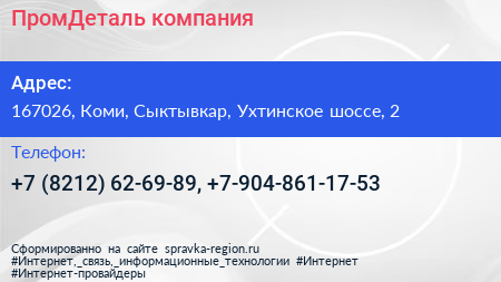 ПромДеталь, компания по адресу 167026, Коми, Сыктывкар, Ухтинское шоссе, 2 в дальнейшем Организация, размещена в следующих категориях: