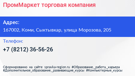 ПромМаркет, торговая компания по адресу 167002, Коми, Сыктывкар, улица Морозова, 205 в дальнейшем Организация, размещена в следующих категориях: