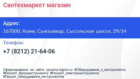 Сантехмаркет, магазин по адресу 167000, Коми, Сыктывкар, Сысольское шоссе, 29/14 в дальнейшем Организация, размещена в следующих категориях: