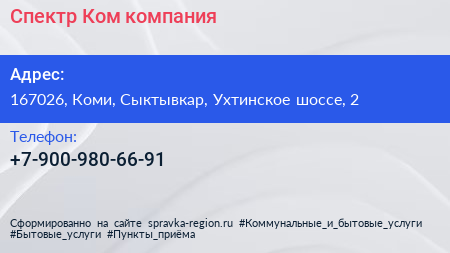 Спектр-Ком, компания по адресу 167026, Коми, Сыктывкар, Ухтинское шоссе, 2 в дальнейшем Организация, размещена в следующих категориях: