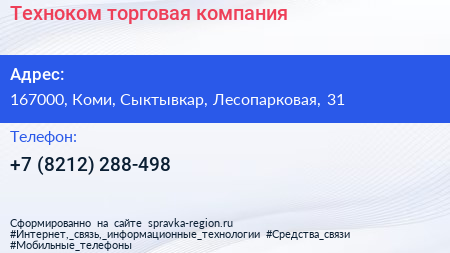 Техноком, торговая компания по адресу 167000, Коми, Сыктывкар, Лесопарковая, 31 в дальнейшем Организация, размещена в следующих категориях: