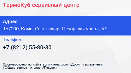 ТермоКуб, сервисный центр по адресу 167000, Коми, Сыктывкар, Печорская улица, 67 в дальнейшем Организация, размещена в следующих категориях: