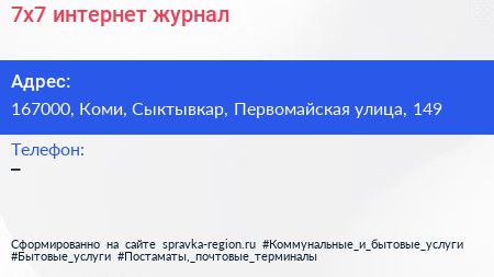 7x7, интернет-журнал по адресу 167000, Коми, Сыктывкар, Первомайская улица, 149 в дальнейшем Организация, размещена в следующих категориях: