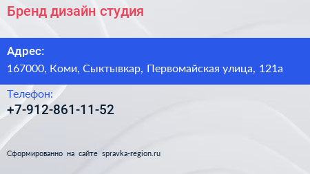 Бренд, дизайн-студия по адресу 167000, Коми, Сыктывкар, Первомайская улица, 121а в дальнейшем Организация, размещена в следующих категориях: