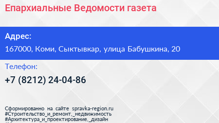 Епархиальные Ведомости, газета по адресу 167000, Коми, Сыктывкар, улица Бабушкина, 20 в дальнейшем Организация, размещена в следующих категориях: