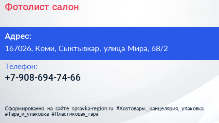 Фотолист, салон по адресу 167026, Коми, Сыктывкар, улица Мира, 68/2 в дальнейшем Организация, размещена в следующих категориях: