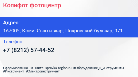 Копифот, фотоцентр по адресу 167005, Коми, Сыктывкар, Покровский бульвар, 1/1 в дальнейшем Организация, размещена в следующих категориях: