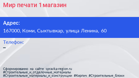 Мир печати №1, магазин по адресу 167000, Коми, Сыктывкар, улица Ленина, 60 в дальнейшем Организация, размещена в следующих категориях: