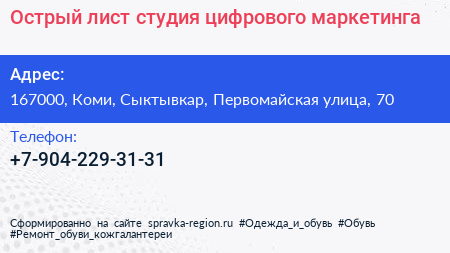 Острый лист, студия цифрового маркетинга по адресу 167000, Коми, Сыктывкар, Первомайская улица, 70 в дальнейшем Организация, размещена в следующих категориях:
