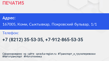 ПЕЧАТИ5 по адресу 167005, Коми, Сыктывкар, Покровский бульвар, 1/1 в дальнейшем Организация, размещена в следующих категориях: