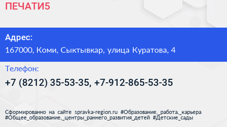 ПЕЧАТИ5 по адресу 167000, Коми, Сыктывкар, улица Куратова, 4 в дальнейшем Организация, размещена в следующих категориях: