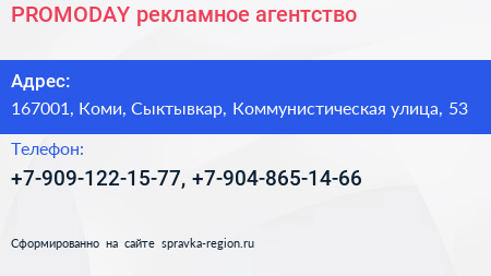 PROMODAY, рекламное агентство по адресу 167001, Коми, Сыктывкар, Коммунистическая улица, 53 в дальнейшем Организация, размещена в следующих категориях: