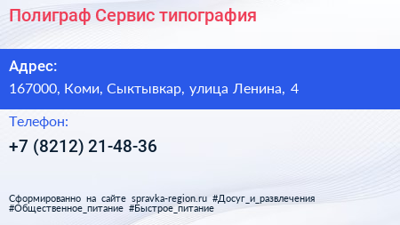 Полиграф-Сервис, типография по адресу 167000, Коми, Сыктывкар, улица Ленина, 4 в дальнейшем Организация, размещена в следующих категориях: