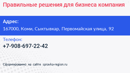 Правильные решения для бизнеса, компания по адресу 167000, Коми, Сыктывкар, Первомайская улица, 92 в дальнейшем Организация, размещена в следующих категориях: