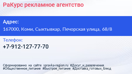 РаКурс, рекламное агентство по адресу 167000, Коми, Сыктывкар, Печорская улица, 68/8 в дальнейшем Организация, размещена в следующих категориях: