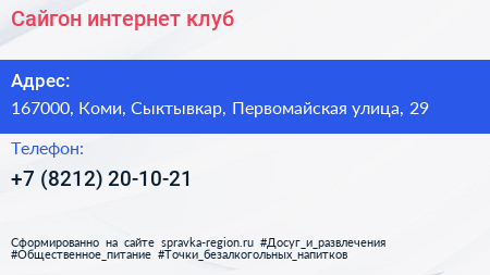 Сайгон, интернет-клуб по адресу 167000, Коми, Сыктывкар, Первомайская улица, 29 в дальнейшем Организация, размещена в следующих категориях: