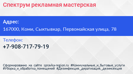 Спектрум, рекламная мастерская по адресу 167000, Коми, Сыктывкар, Первомайская улица, 78 в дальнейшем Организация, размещена в следующих категориях: