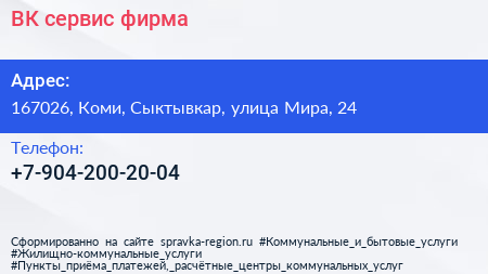 ВК-сервис, фирма по адресу 167026, Коми, Сыктывкар, улица Мира, 24 в дальнейшем Организация, размещена в следующих категориях: