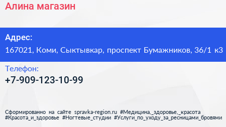 Алина, магазин по адресу 167021, Коми, Сыктывкар, проспект Бумажников, 36/1 к3 в дальнейшем Организация, размещена в следующих категориях: