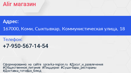 Alir, магазин по адресу 167000, Коми, Сыктывкар, Коммунистическая улица, 18 в дальнейшем Организация, размещена в следующих категориях: