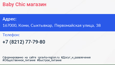 Baby Chic, магазин по адресу 167000, Коми, Сыктывкар, Первомайская улица, 38 в дальнейшем Организация, размещена в следующих категориях: