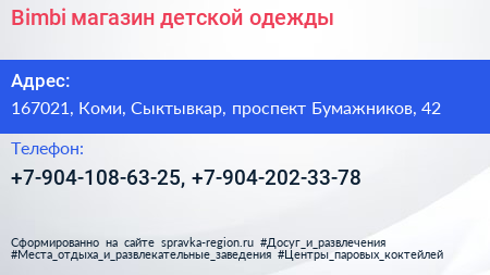 Bimbi, магазин детской одежды по адресу 167021, Коми, Сыктывкар, проспект Бумажников, 42 в дальнейшем Организация, размещена в следующих категориях:
