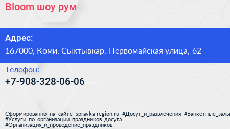 Bloom, шоу-рум по адресу 167000, Коми, Сыктывкар, Первомайская улица, 62 в дальнейшем Организация, размещена в следующих категориях: