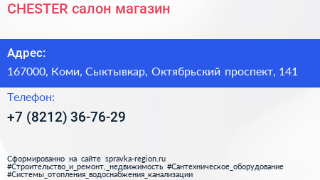 CHESTER, салон-магазин по адресу 167000, Коми, Сыктывкар, Октябрьский проспект, 141 в дальнейшем Организация, размещена в следующих категориях: