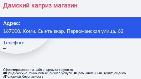 Дамский каприз, магазин по адресу 167000, Коми, Сыктывкар, Первомайская улица, 62 в дальнейшем Организация, размещена в следующих категориях: