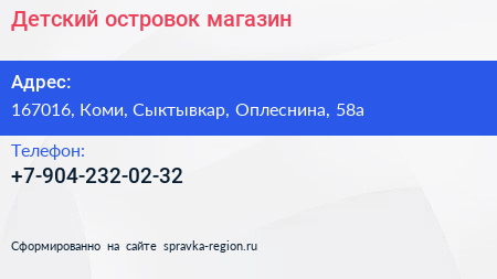 Детский островок, магазин по адресу 167016, Коми, Сыктывкар, Оплеснина, 58а в дальнейшем Организация, размещена в следующих категориях: