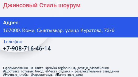 Джинсовый Стиль, шоурум по адресу 167000, Коми, Сыктывкар, улица Куратова, 73/6 в дальнейшем Организация, размещена в следующих категориях: