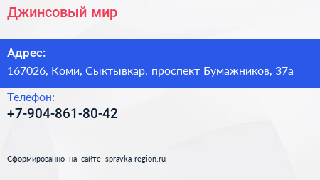 Джинсовый мир по адресу 167026, Коми, Сыктывкар, проспект Бумажников, 37а в дальнейшем Организация, размещена в следующих категориях: