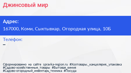 Джинсовый мир по адресу 167000, Коми, Сыктывкар, Огородная улица, 10Б в дальнейшем Организация, размещена в следующих категориях:
