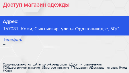 Доступ, магазин одежды по адресу 167031, Коми, Сыктывкар, улица Орджоникидзе, 50/1 в дальнейшем Организация, размещена в следующих категориях: