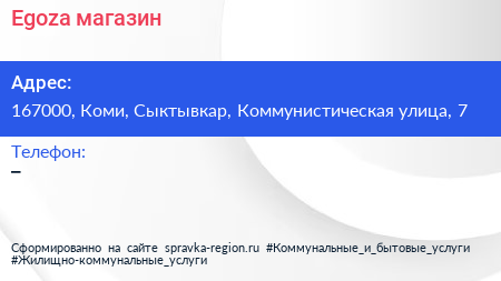 Egoza, магазин по адресу 167000, Коми, Сыктывкар, Коммунистическая улица, 7 в дальнейшем Организация, размещена в следующих категориях: