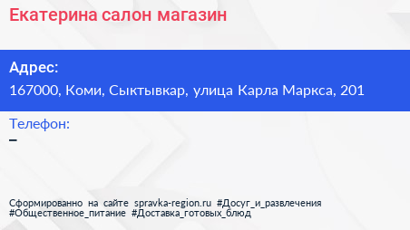 Екатерина, салон-магазин по адресу 167000, Коми, Сыктывкар, улица Карла Маркса, 201 в дальнейшем Организация, размещена в следующих категориях: