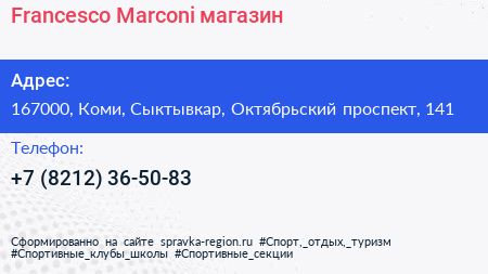 Francesco Marconi, магазин по адресу 167000, Коми, Сыктывкар, Октябрьский проспект, 141 в дальнейшем Организация, размещена в следующих категориях: