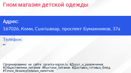 Гном, магазин детской одежды по адресу 167026, Коми, Сыктывкар, проспект Бумажников, 37а в дальнейшем Организация, размещена в следующих категориях:
