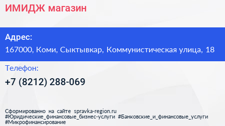 ИМИДЖ, магазин по адресу 167000, Коми, Сыктывкар, Коммунистическая улица, 18 в дальнейшем Организация, размещена в следующих категориях:
