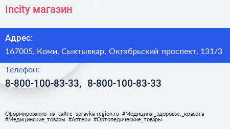 Incity, магазин по адресу 167005, Коми, Сыктывкар, Октябрьский проспект, 131/3 в дальнейшем Организация, размещена в следующих категориях: