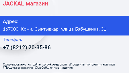 JACKAL, магазин по адресу 167000, Коми, Сыктывкар, улица Бабушкина, 31 в дальнейшем Организация, размещена в следующих категориях: