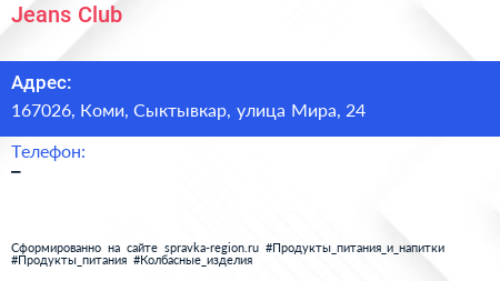 Jeans Club по адресу 167026, Коми, Сыктывкар, улица Мира, 24 в дальнейшем Организация, размещена в следующих категориях: