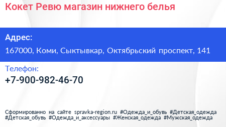 Кокет Ревю, магазин нижнего белья по адресу 167000, Коми, Сыктывкар, Октябрьский проспект, 141 в дальнейшем Организация, размещена в следующих категориях: