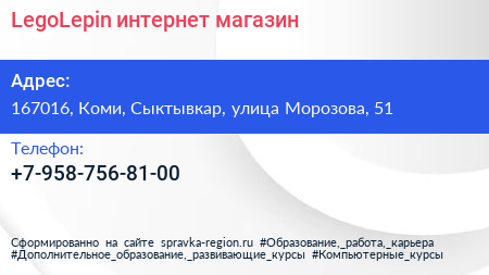 LegoLepin, интернет-магазин по адресу 167016, Коми, Сыктывкар, улица Морозова, 51 в дальнейшем Организация, размещена в следующих категориях: