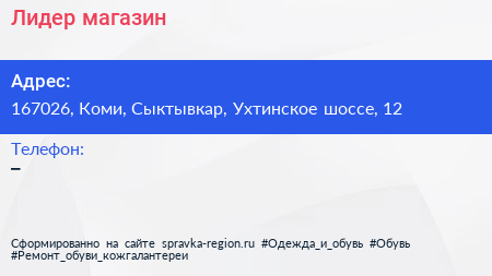 Лидер, магазин по адресу 167026, Коми, Сыктывкар, Ухтинское шоссе, 12 в дальнейшем Организация, размещена в следующих категориях: