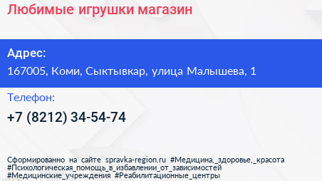 Любимые игрушки, магазин по адресу 167005, Коми, Сыктывкар, улица Малышева, 1 в дальнейшем Организация, размещена в следующих категориях: