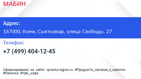 МАБИН по адресу 167000, Коми, Сыктывкар, улица Свободы, 27 в дальнейшем Организация, размещена в следующих категориях: