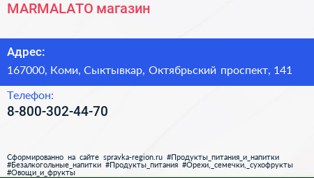 MARMALATO, магазин по адресу 167000, Коми, Сыктывкар, Октябрьский проспект, 141 в дальнейшем Организация, размещена в следующих категориях: