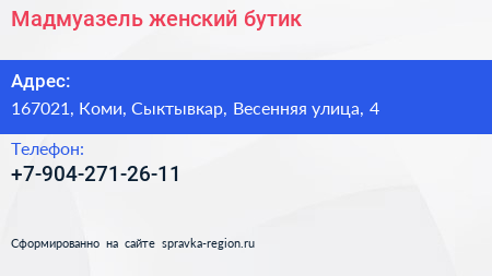 Мадмуазель, женский бутик по адресу 167021, Коми, Сыктывкар, Весенняя улица, 4 в дальнейшем Организация, размещена в следующих категориях:
